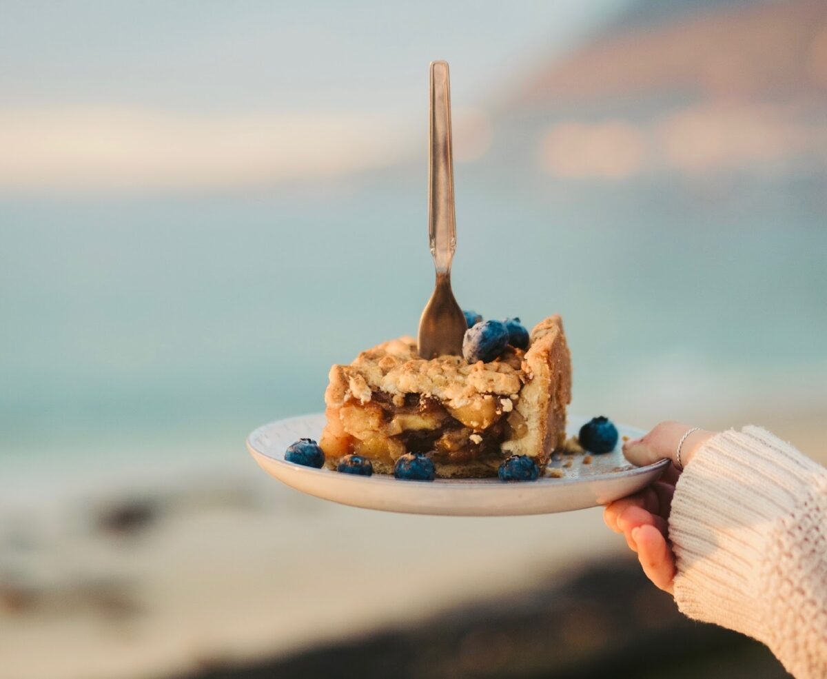 Zeker als de taart nog warm is, is ie behoorlijk brokkelig en valt snel uit elkaar); Afgekoeld in de koelkast wordt ie steviger; maar hij is altijd lekker….