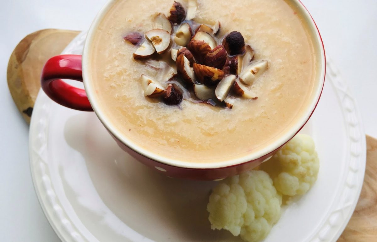 Doe de soep in kommen en verdeel de gehakte hazelnootjes en de blokjes feta erover.