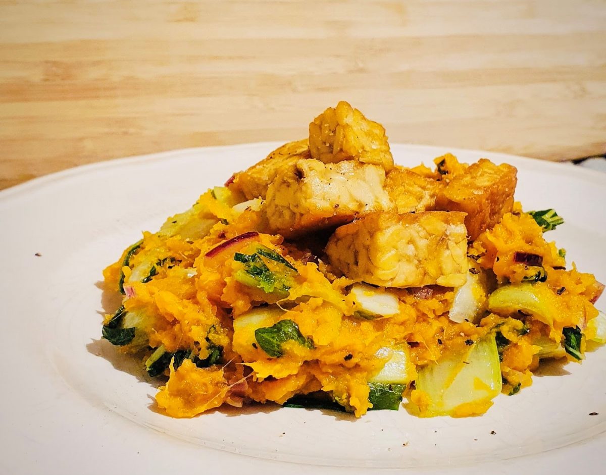 Meng de paksoi door de puree en bestrooi het met de tempeh blokjes.